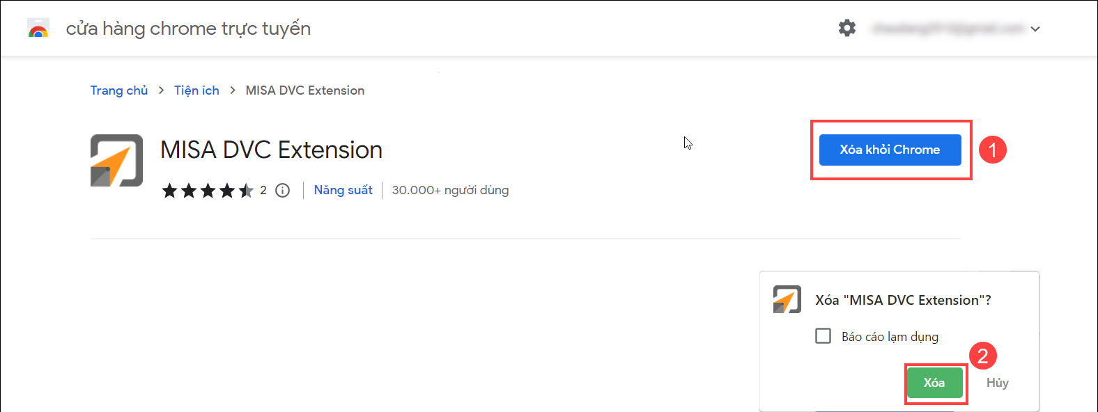 - Trình duyệt hỏi Xóa “MISA DVC Extension”? Nhấn Xóa