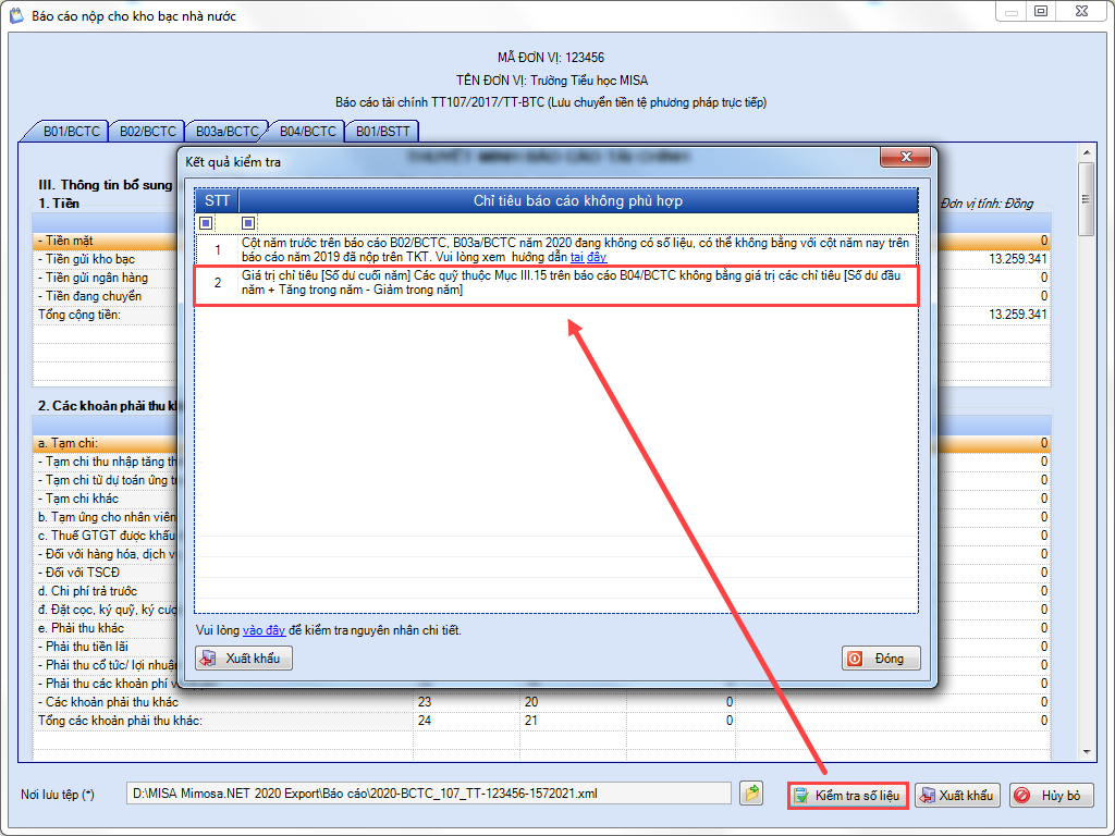 Khi xuất khẩu Báo cáo nộp cho kho bạc nhà nước, tích vào phần Kiểm tra số liệu phần mềm báo lỗi Các chỉ tiêu không phù hợp: