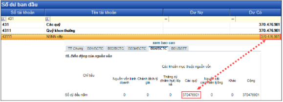 - Vào Nghiệp vụ/Nhập số dư ban đầu/Nhập số dư của các TK 411,TK 413, TK 421, TK 431, TK 468 sao cho khớp với số dư đầu năm của Nguồn vốn kinh doanh (411), Chênh lệch tỷ giá (413), Thặng dư(thâm hụt) lũy kế (421), Các quỹ (431), Nguồn CCTL (468) trên báo cáo TKT