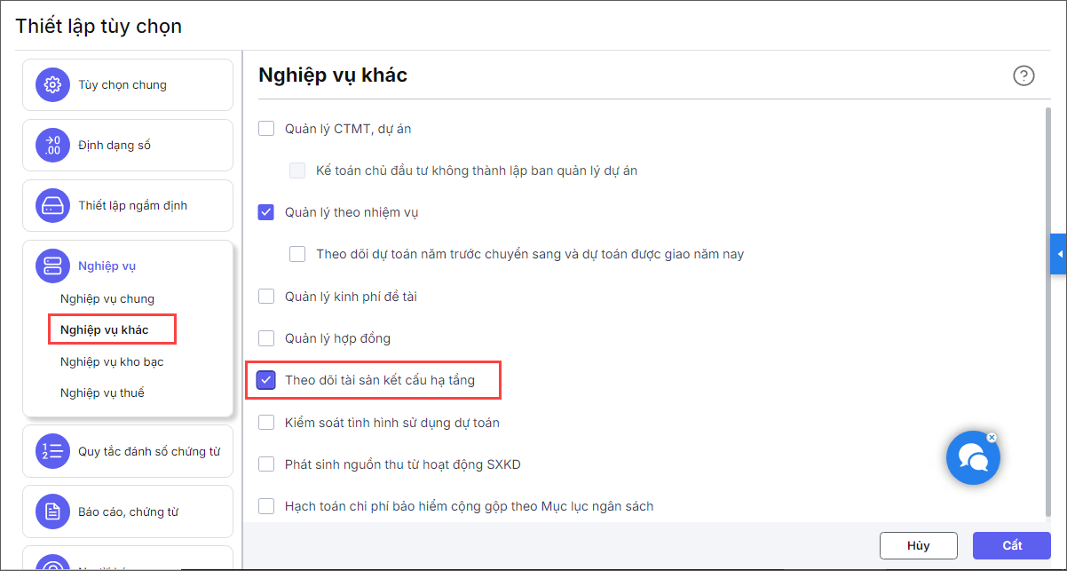 Bước 3: Tích chọn vào ô Theo dõi tài sản kết cấu hạ tầng. Nhấn Cất.