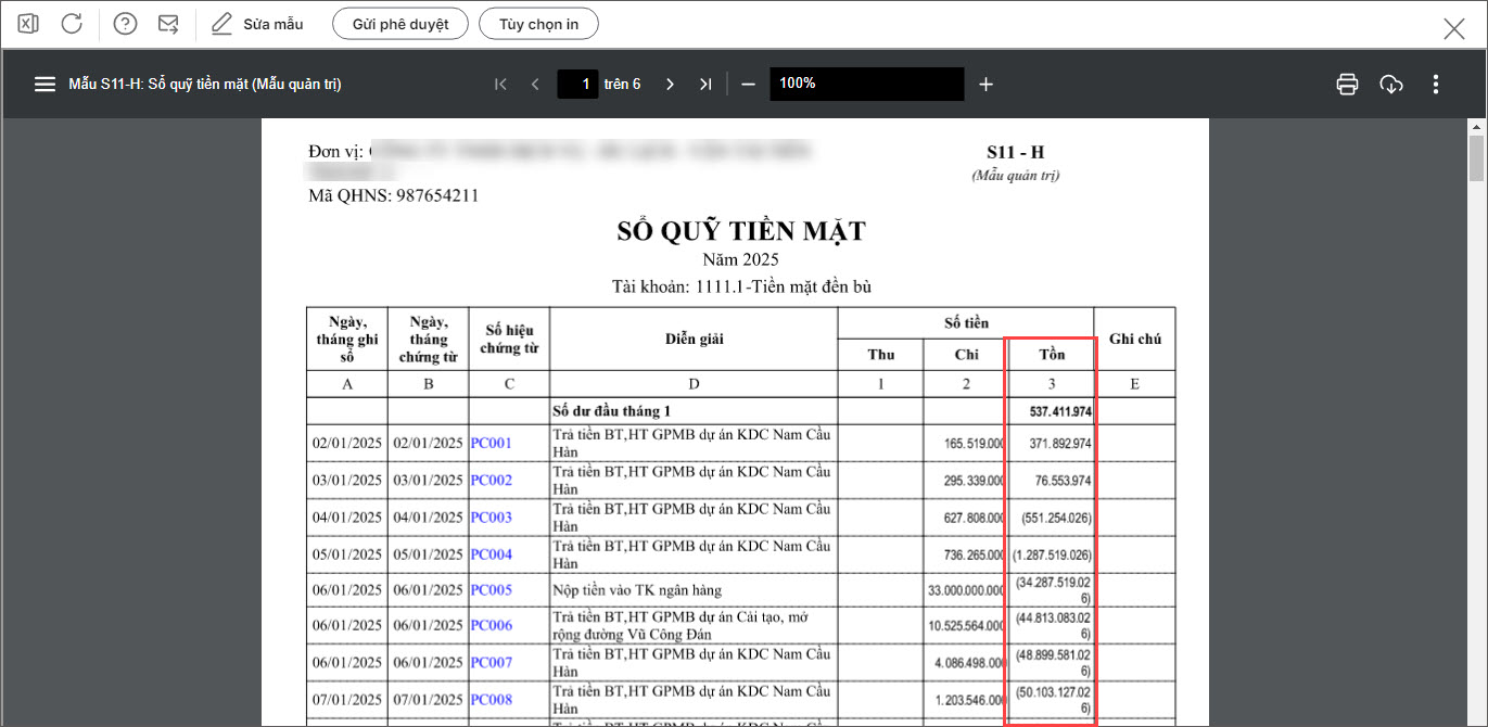 Bước 3: Nhấn vào Số hiệu tài khoản => chương trình sẽ chuyển sang màn hình Sổ quỹ tiền mặt để kiểm tra báo cáo để xác định nguyên nhân và cách xử lý.