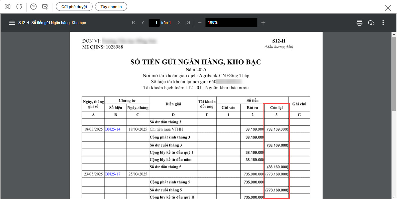 Bước 3: Nhấn vào Số hiệu tài khoản => chương trình sẽ chuyển sang màn hình Sổ tiền gửi ngân hàng, kho bạc để kiểm tra báo cáo để xác định nguyên nhân và cách xử lý.