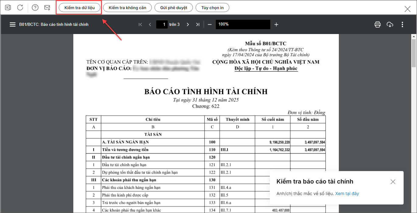 - Trên màn hình in B01/BCTC: Báo cáo tình hình tài chính, nhấn vào chức năng Kiểm tra dữ liệu.