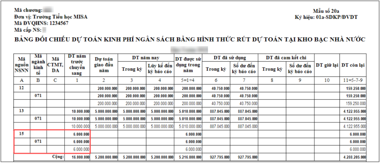 Bài viết này nhằm hướng dẫn quy trình chuyển số dư dự toán từ nguồn 15 sang nguồn 12 tại cột 1 “Dự toán năm trước chuyển sang” trên báo cáo đối chiếu kho bạc mẫu số 20a (01a-SDKP/ĐVDT hoặc mẫu số 26). Việc này đảm bảo số liệu phản ánh đúng nguồn kinh phí theo nhu cầu quản lý và quy định hiện hành.