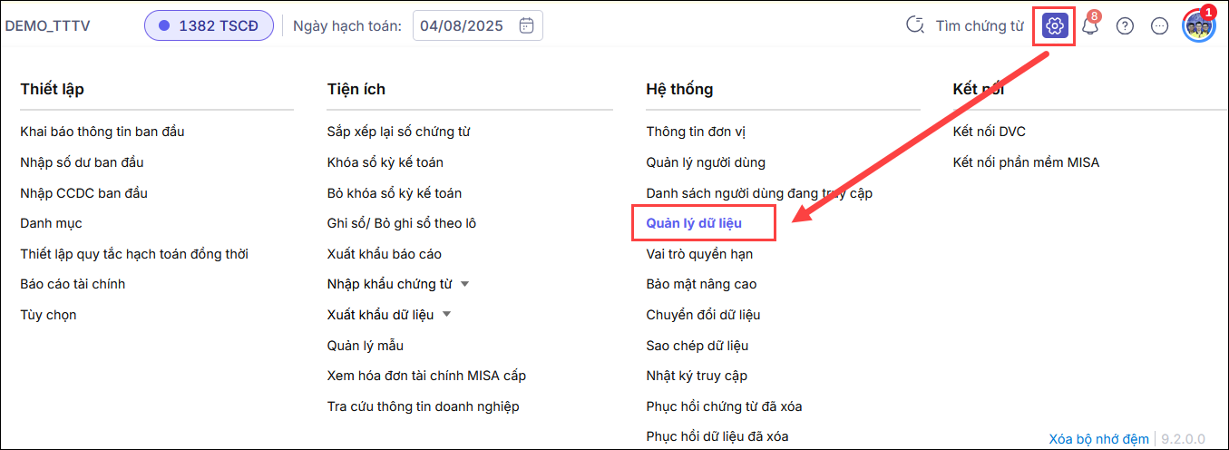 - Vào Bánh răng ⚙(góc phải bên trên)\Hệ thống\Quản lý dữ liệu.