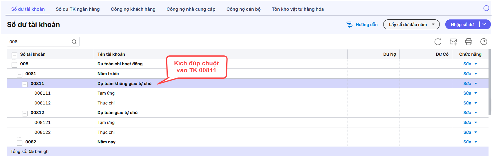 2. Bạn muốn chuyển số dư dự toán nguồn 15 sang nguồn 12 thì Kích đúp chuột tại TK 00811