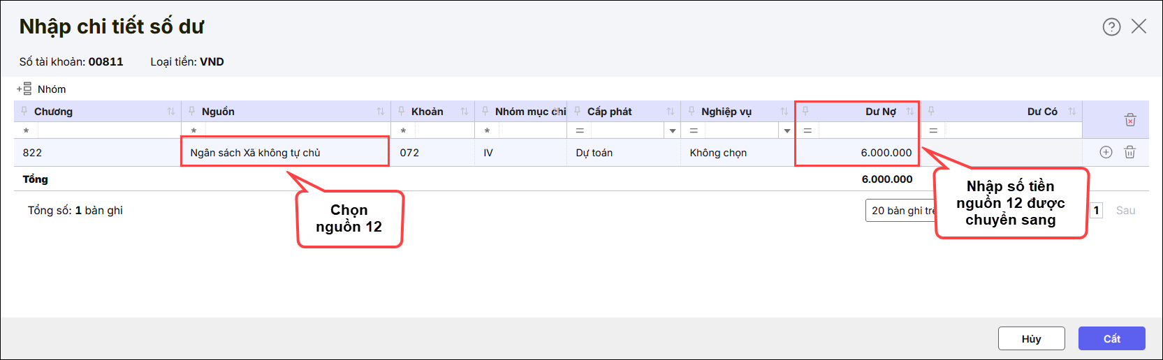 3. Nhập số dư dự toán năm trước chuyển sang vào bên Dư Nợ của TK 00811, chọn tương ứng nguồn 12