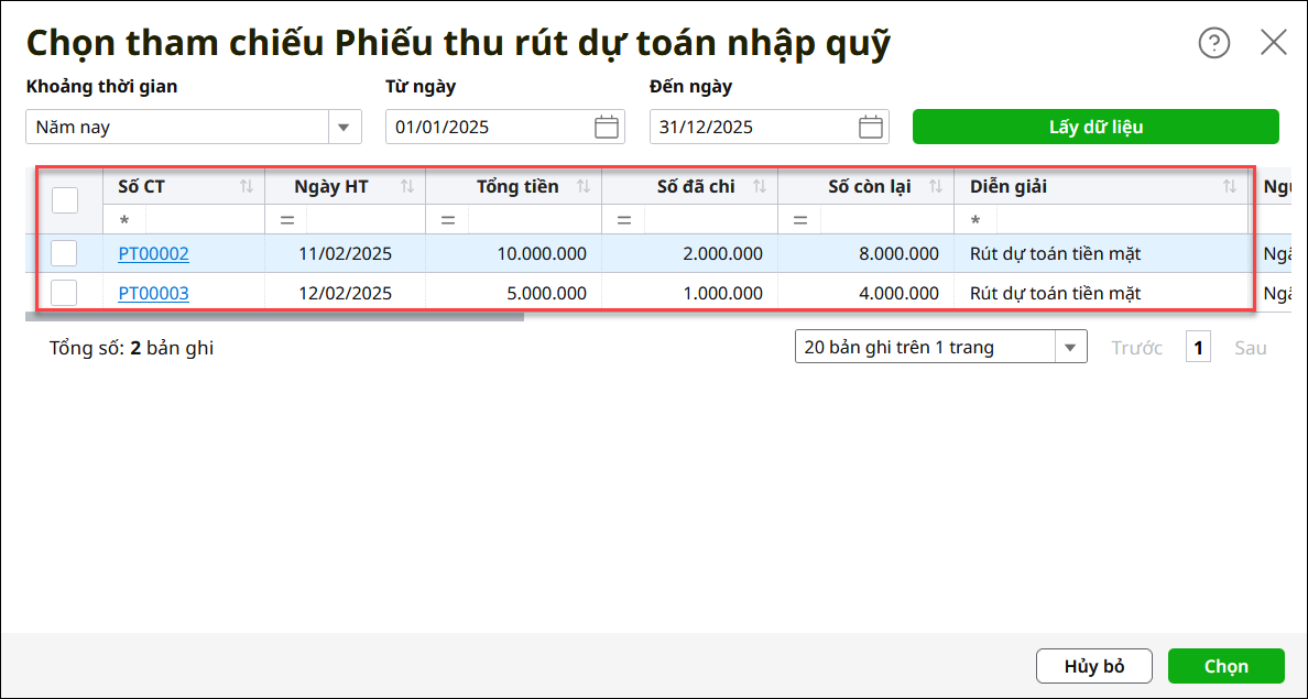 *Lưu ý: 1 phiếu chi sẽ chỉ được tham chiếu đến 1 phiếu thu rút dự toán nhập quỹ.