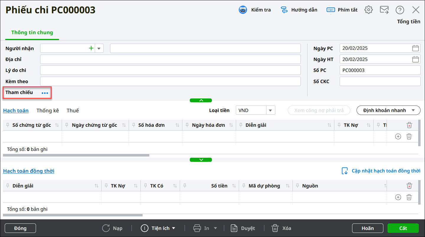 Bước 1: Trên giao diện Phiếu chi, chọn biểu tượng 3 chấm tại thông tin Tham chiếu. Chức năng này giúp anh/chị biết được phiếu thu rút dự toán nhập quỹ nào chưa chi hết để lập chứng từ chi cho hợp lý
