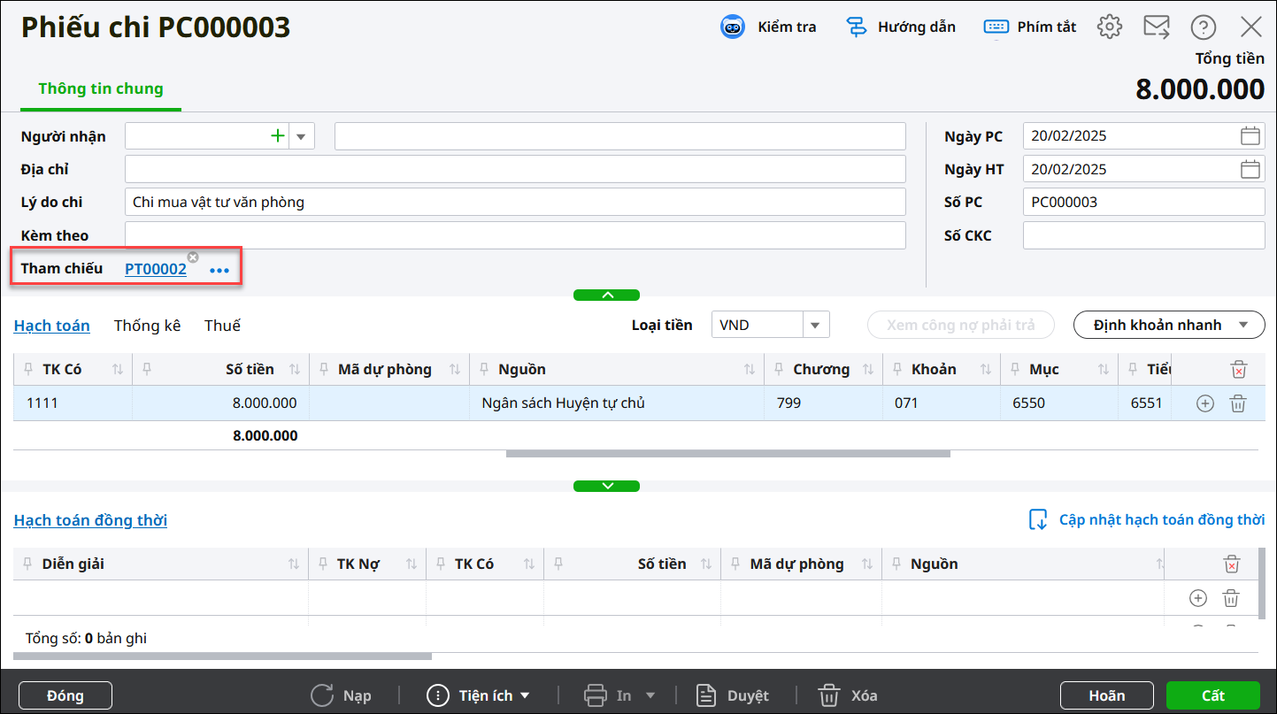 => Ngày 20/02/2025, kế toán lập chứng từ chi tiền mặt để chi mua vật tư văn phòng số tiền còn lại từ PT00002: số chứng từ PT00002, tiểu mục 6551, số tiền 8.000.000 đồng.