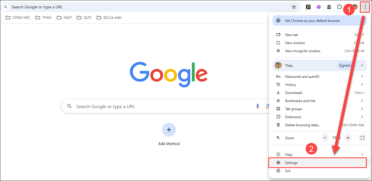 Bước 1: Vào Google Chrome, nhấn vào biểu tượng ba chấm, chọn Settings (Cài đặt).