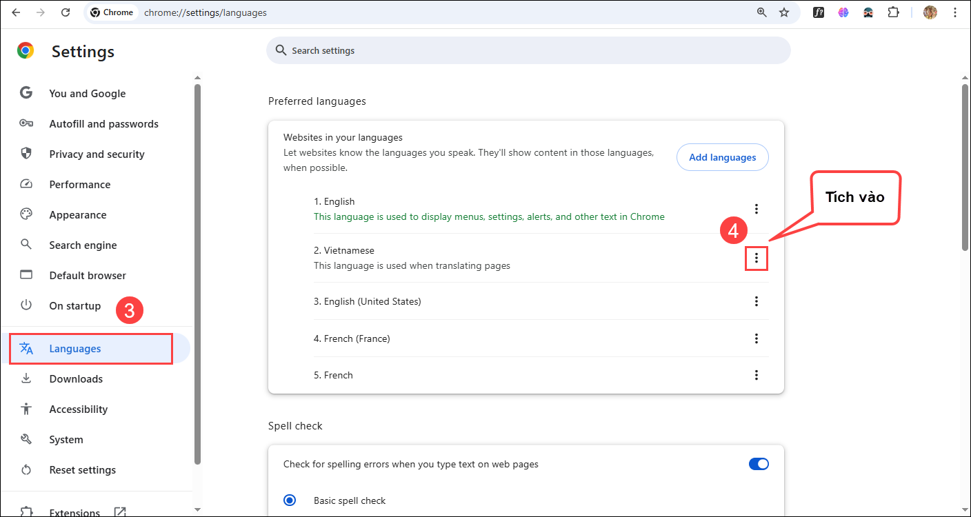 Bước 2: Nhấn vào phần Languages để show hết các ngôn ngữ đang có trên Google Chrome. Nếu đã có ngôn ngữ Tiếng Việt (Vietnamese) rồi thì nhấn vào biểu tượng 3 chấm tại ngôn ngữ Vietnamese.