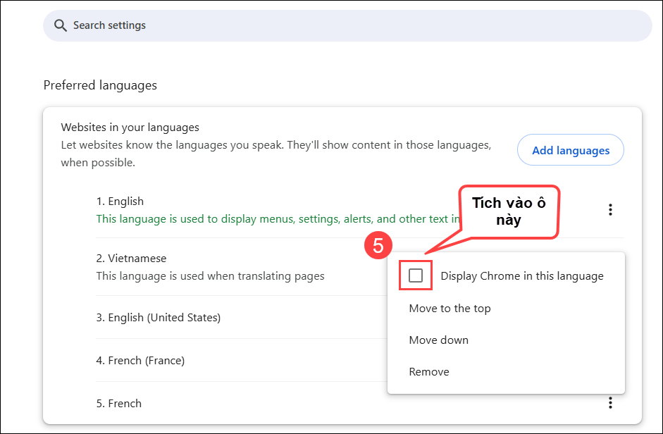 • Còn nếu chưa có ngôn ngữ Tiếng Việt thì nhấn Add languages (Thêm ngôn ngữ) để thêm ngôn ngữ Tiếng Việt.
