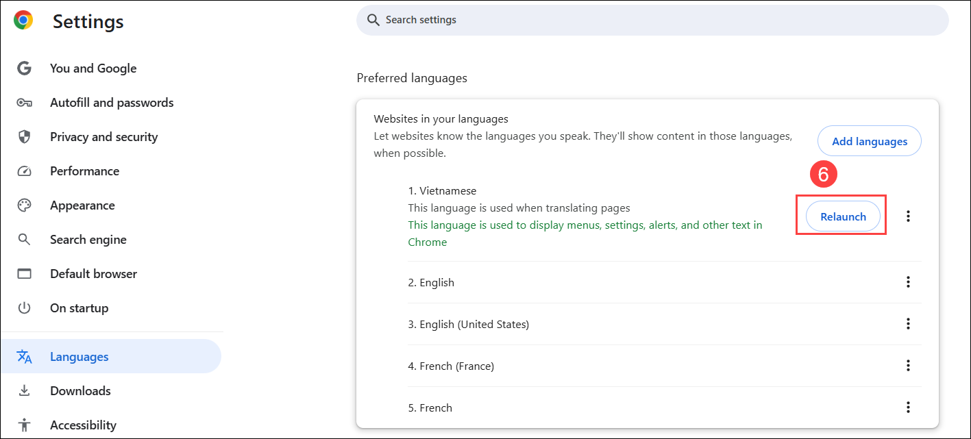Bước 4: Nhấn Relaunch (Chạy lại) để chuyển đổi ngôn ngữ từ Tiếng Anh sang Tiếng Việt.
