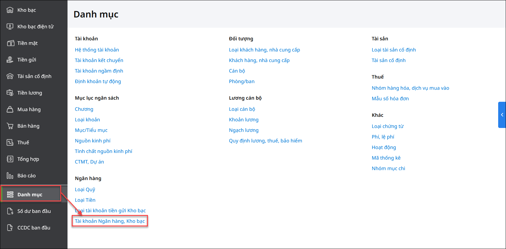 - Vào Danh mục\Tài khoản ngân hàng, kho bạc.