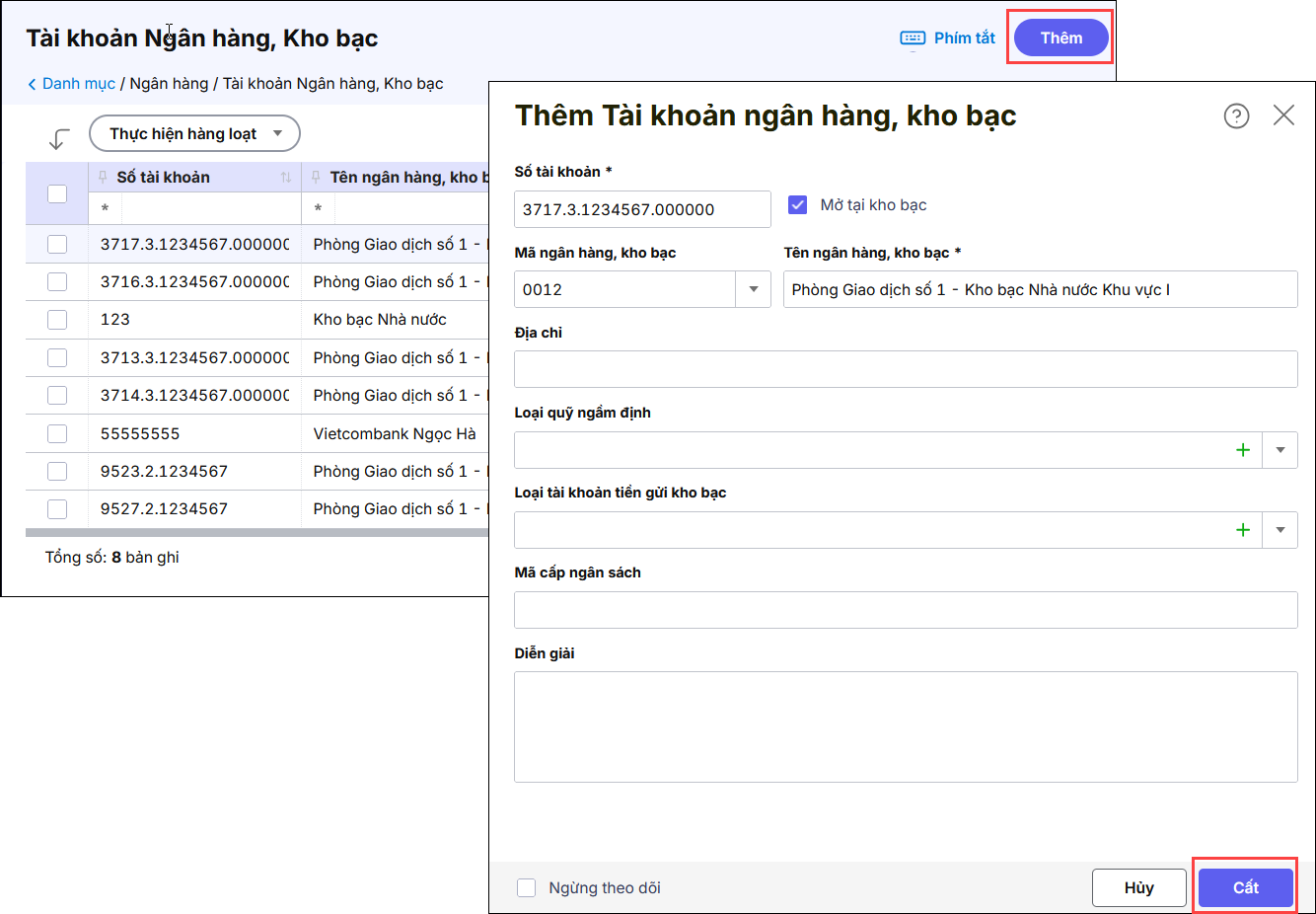 Bước 1: Thêm Tài khoản kho bạc 3716, 3717 ở danh mục Tài khoản Ngân hàng, kho bạc