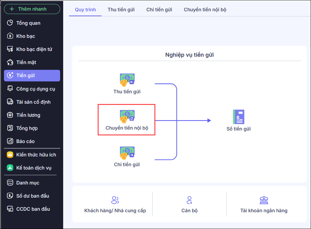 - Vào phân hệ Tiền gửi\Chuyển tiền nội bộ.
