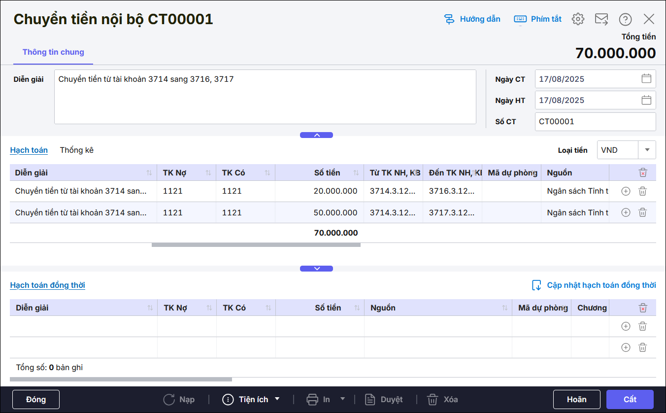 - Khai báo thông tin chi tiết chứng từ Chuyển tiền nội bộ