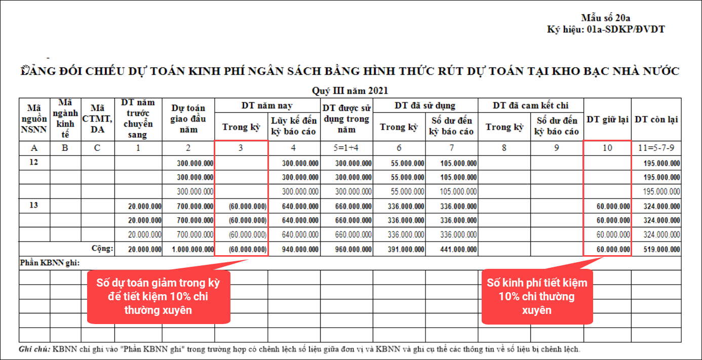 Bài viết này hướng dẫn điều chỉnh giảm dự toán năm nay (Cột 3) cho nguồn 12 hoặc nguồn 13 (phục vụ việc tiết kiệm chi thường xuyên). Đồng thời, hướng dẫn cách thiết lập để số liệu này hiển thị đúng trên Cột 10 (Dự toán giữ lại) của báo cáo mẫu số 20a (Ký hiệu 01a-SDKP/ĐVDT).