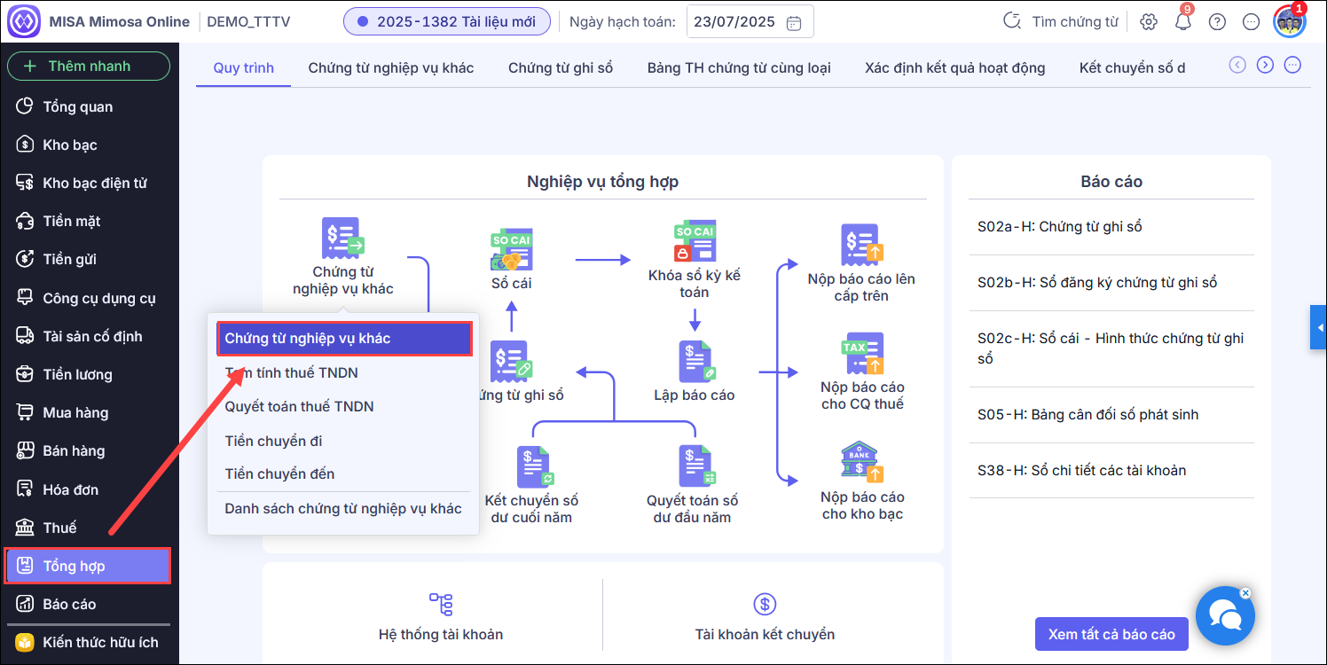 Bước 1: Vào phân hệ Tổng hợp\Chứng từ nghiệp vụ khác.