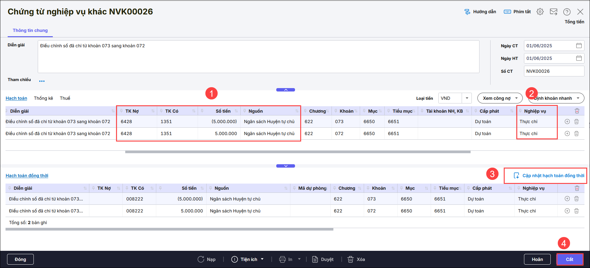 - Nợ TK 6428/Có TK 1351: Số tiền dương 10.000.000,tiểu mục 6551, Khoản 132 nghiệp vụ chọn Thực chi