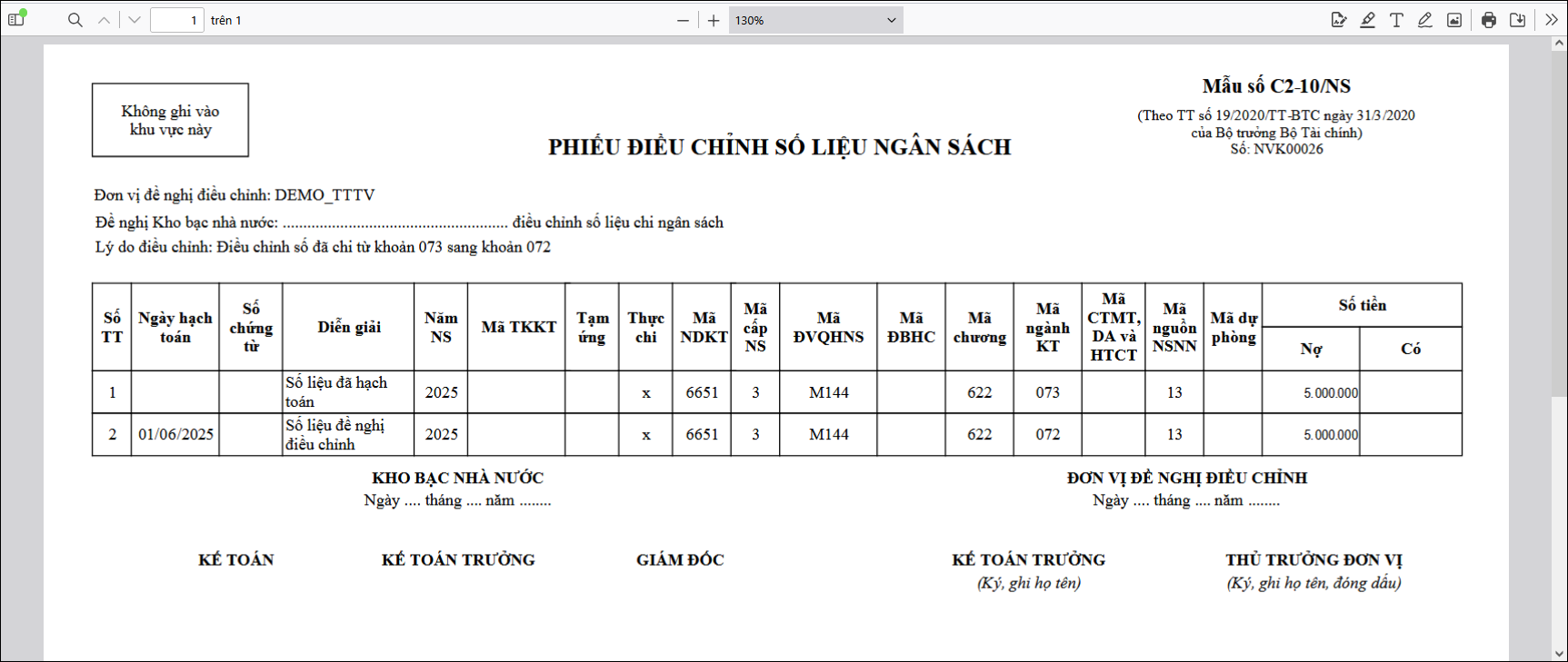 Bước 4: Nhấn In/chọn mẫu Phiếu điều chỉnh số liệu ngân sách (C2-10/NS) để làm thủ tục với Kho bạc