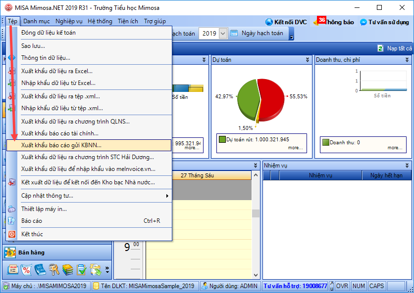 1. Chọn menu Tệp\Xuất khẩu báo cáo gửi KBNN.