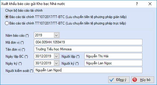2. Chọn bộ báo cáo tài chính. Ví dụ đơn vị chọn xuất khẩu Báo cáo tài chính TT 107/2017/TT-BTC (Lưu chuyển tiền tệ phương pháp trực tiếp).