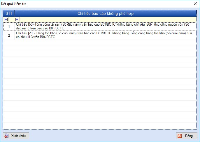 7. Nhấn Xuất khẩu để xuất khẩu danh sách Chỉ tiêu báo cáo không phù hợp ra file excel. Sau đó, thực hiện sửa lại số liệu trên phần mềm như trên danh sách đã chỉ ra.