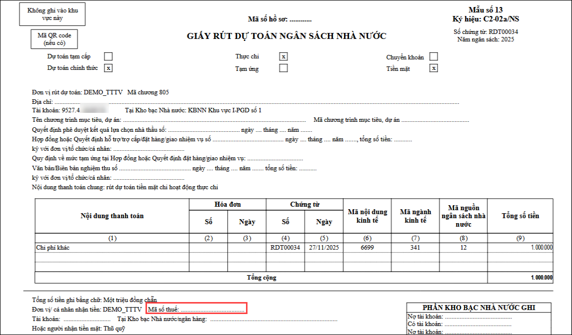 Nếu khai báo sai, khi in C2-02a/NS: Giấy rút dự toán ngân sách nhà nước (mẫu số 13) hệ thống sẽ không hiển thị đúng mã 2 ký tự mà chỉ lấy 2 ký tự cuối, dẫn đến hiển thị sai mã nguồn ngân sách nhà nước thành 2. hoặc 00. - Dấu ngạch ngang trên mẫu 13 giấy rút dự toán C2-02a/NS dưới phần Tổng cộng số tiền được quy định ở Nghị định 347/2025/NĐ-CP nên không bỏ dấu này khi in trên phần mềm được.