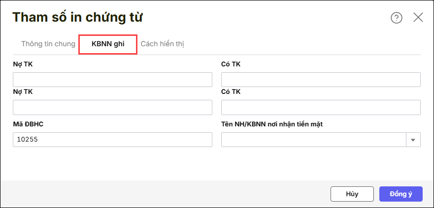 5. Thông tin mã địa bàn hành chính, Tên NH/KBNN nơi nhận tiền mặt thì Tại bảng tham số in chứng từ, tích Tab KBNN ghi (Kho bạc Nhà nước ghi)