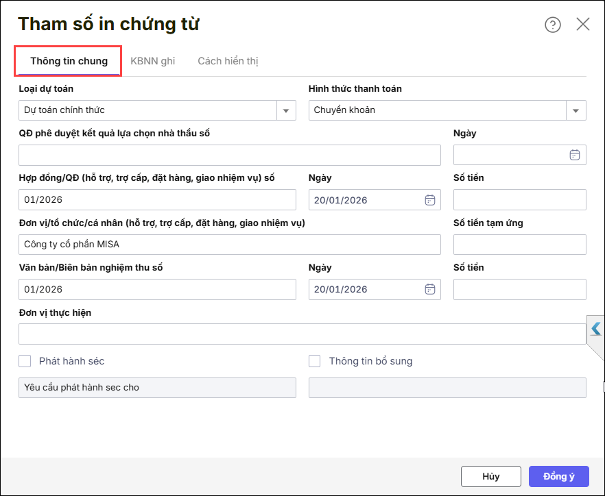 6. Thông tin Hình thức thanh toán, Số hợp đồng, Văn bản/Biên bản nghiệm thu,… thì tại bảng Tham số in chứng từ, Tab Thông tin chung: