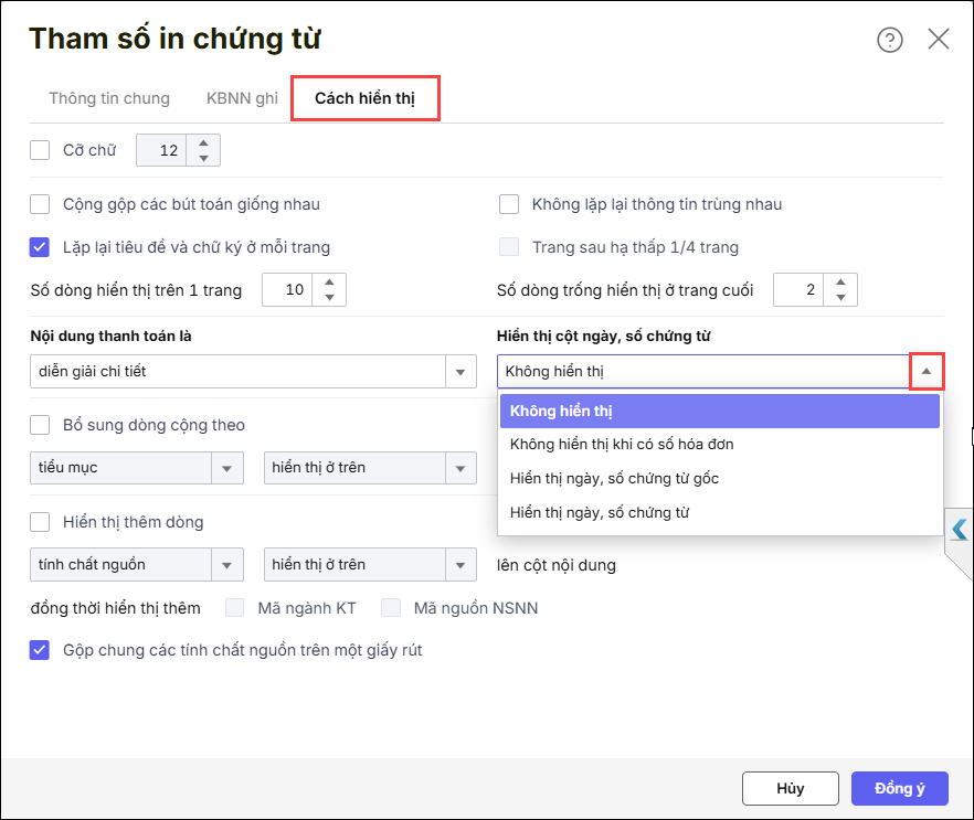 Chọn Hiển thị ngày, số chứng từ gốc nếu lấy theo cột ngày và số chứng từ gốc đã nhập trên chứng từ.