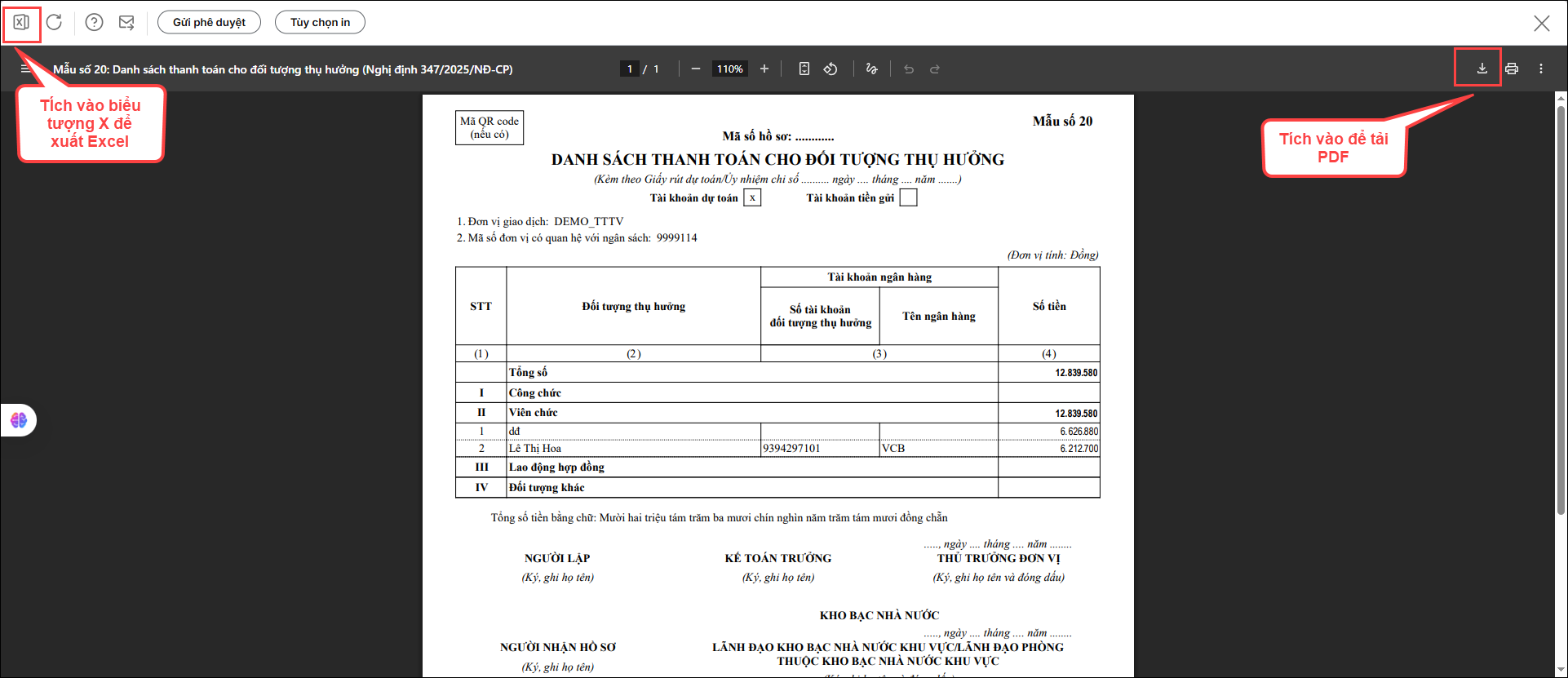 Bước 3: Xuất khẩu PDF hoặc Excel mẫu 20 – Danh sách thanh toán cho đối tượng thụ hưởng