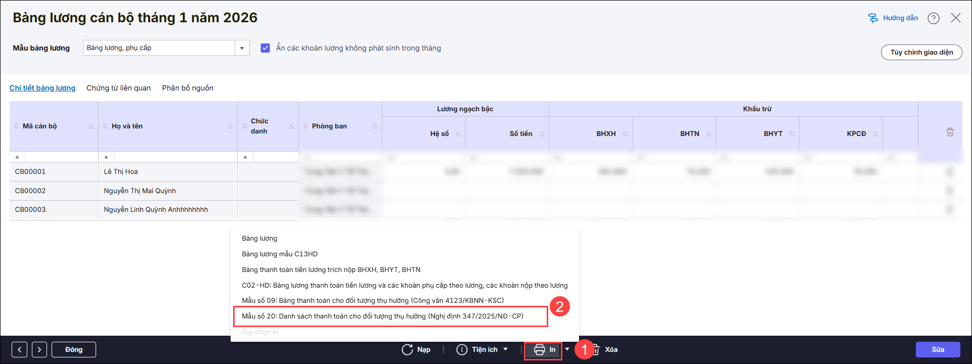 - Trên bảng lương đã tạo ở Bước 1, tích đúp chuột vào Chọn In\Chọn Mẫu số 20: Danh sách thanh toán cho đối tượng thụ hưởng (Nghị định 347/2025/NĐ-CP)