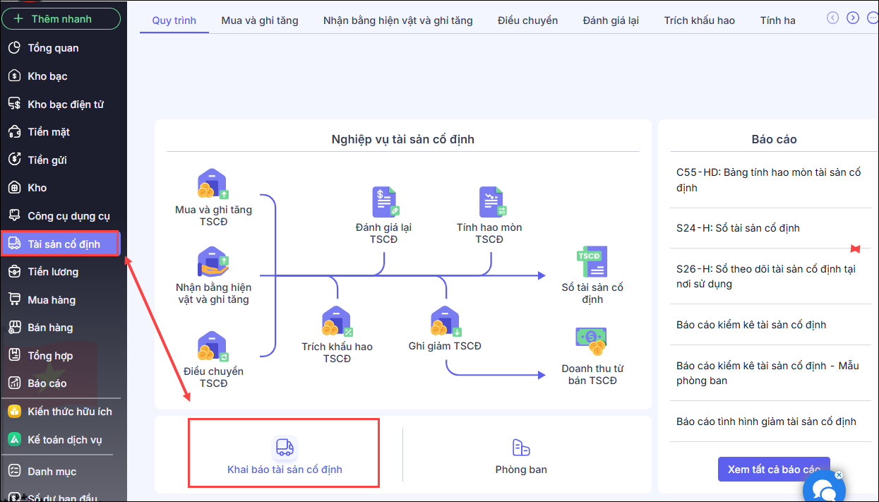 Bước 1. Vào phân hệ TSCĐ/Chọn Khai báo TSCĐ