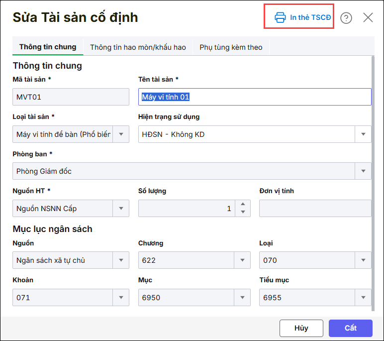 Bước 3. Nhấn In thẻ TSCĐ ở góc trên bên phải