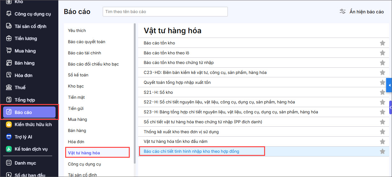 Bước 2: Kích đúp chuột vào Báo cáo chi tiết tình hình nhập kho theo hợp đồng.