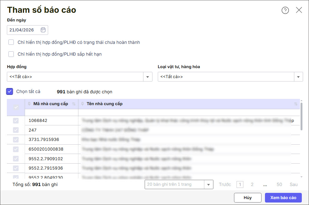 Bước 3: Khai báo tham số in và nhấn Xem báo cáo.