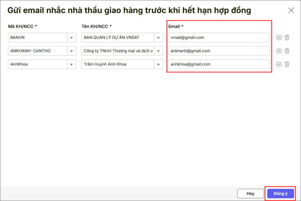 Bước 6: Nhấn Đồng ý sau khi đã nhập đủ các email của các nhà thầu cần thông báo.