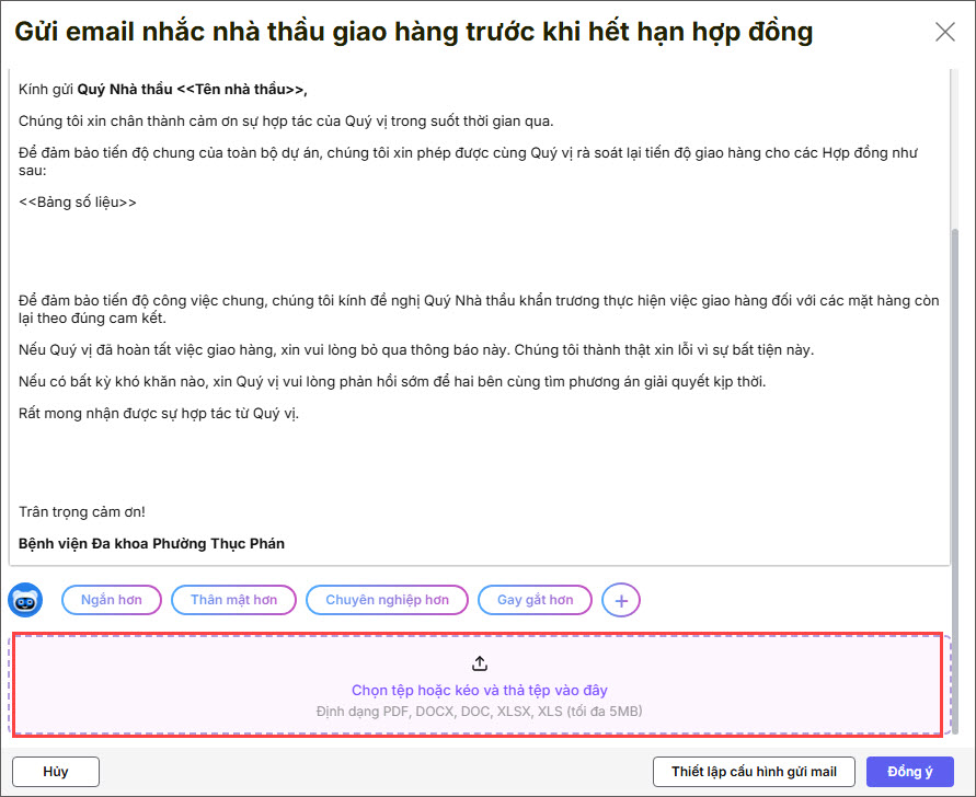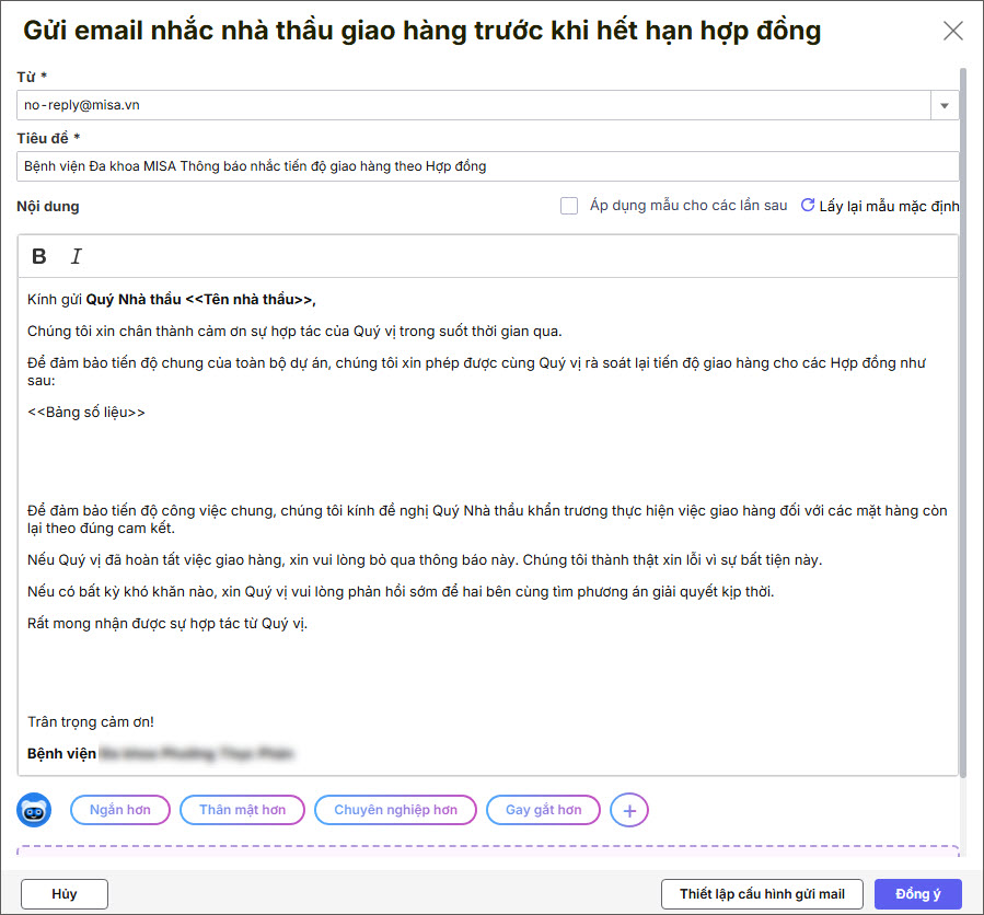 Bài viết này nhằm hướng dẫn bạn có thể gửi email nhắc nhà cung cấp giao hàng trước khi hết hạn hợp đồng ngay trên ứng dụng, tránh việc giao hàng trễ hẹn, ảnh hưởng đến hoạt động của bệnh viện.