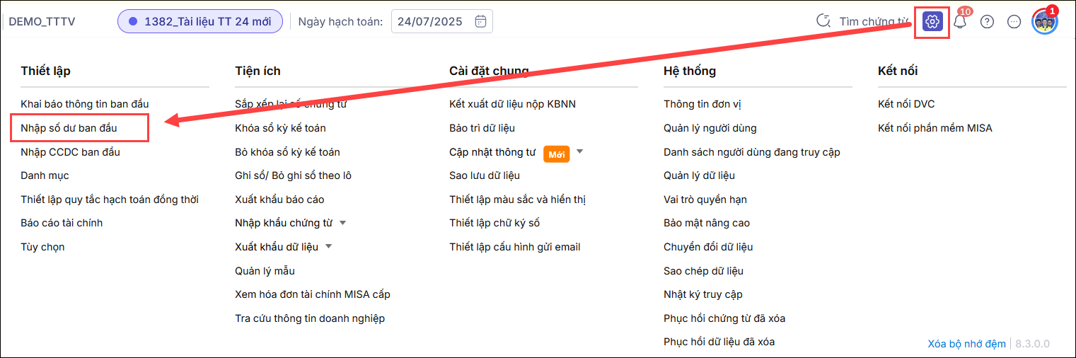 Bước 1: Vào biểu tượng bánh răng ⚙\Thiết lập\Nhập số dư ban đầu.