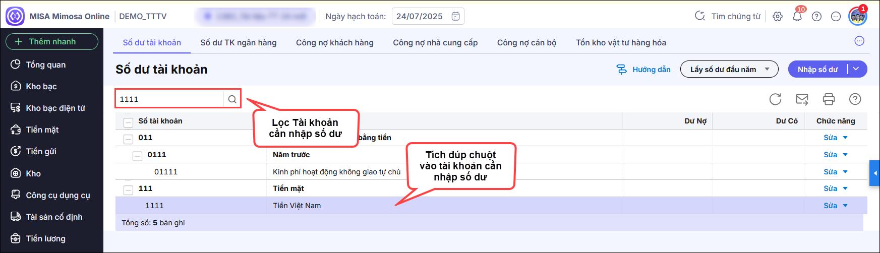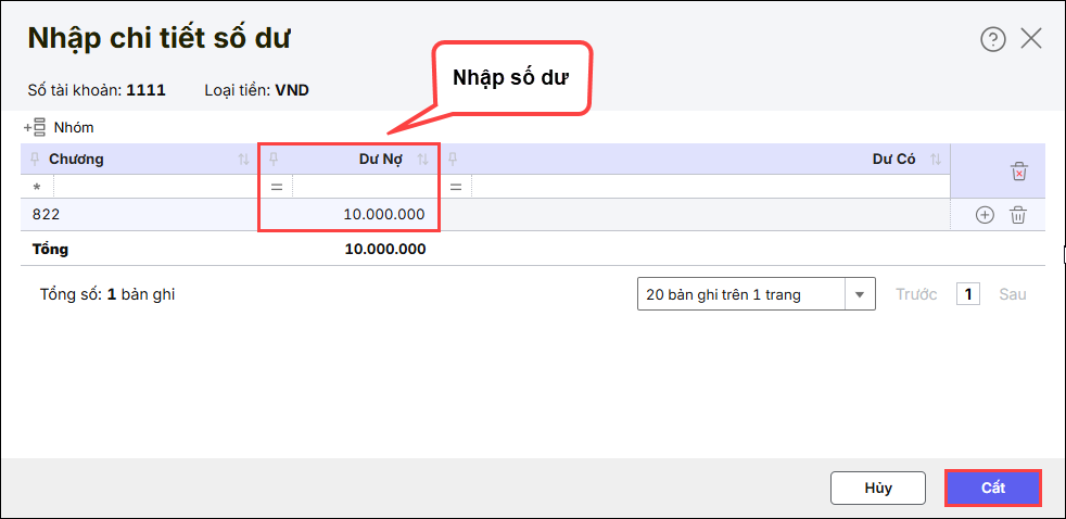 Bước 3: Nhập số dư cho tài khoản vào cột Dư Nợ/Dư Có