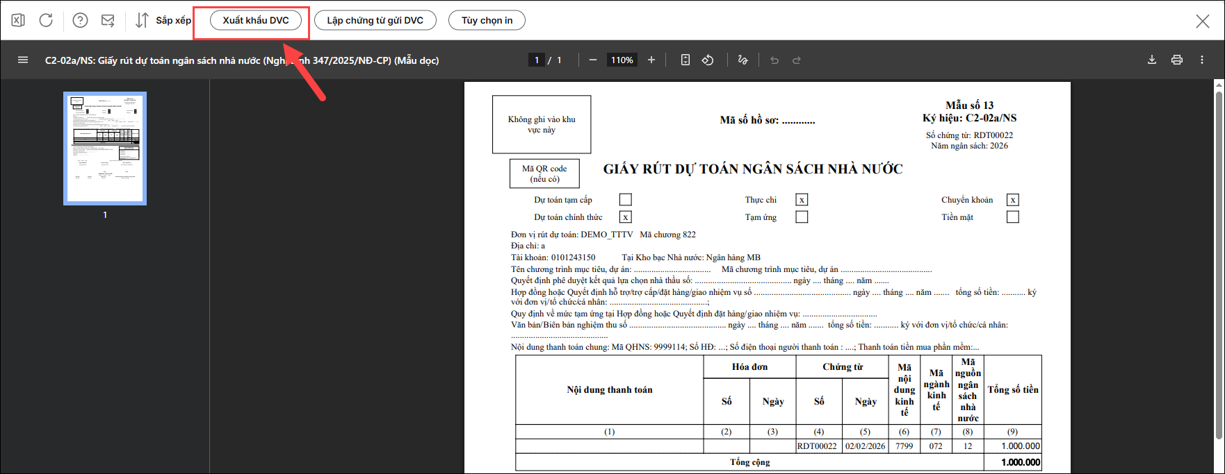 Phần mềm đã hỗ trợ xuất khẩu DVC 4 mẫu biểu chứng từ: