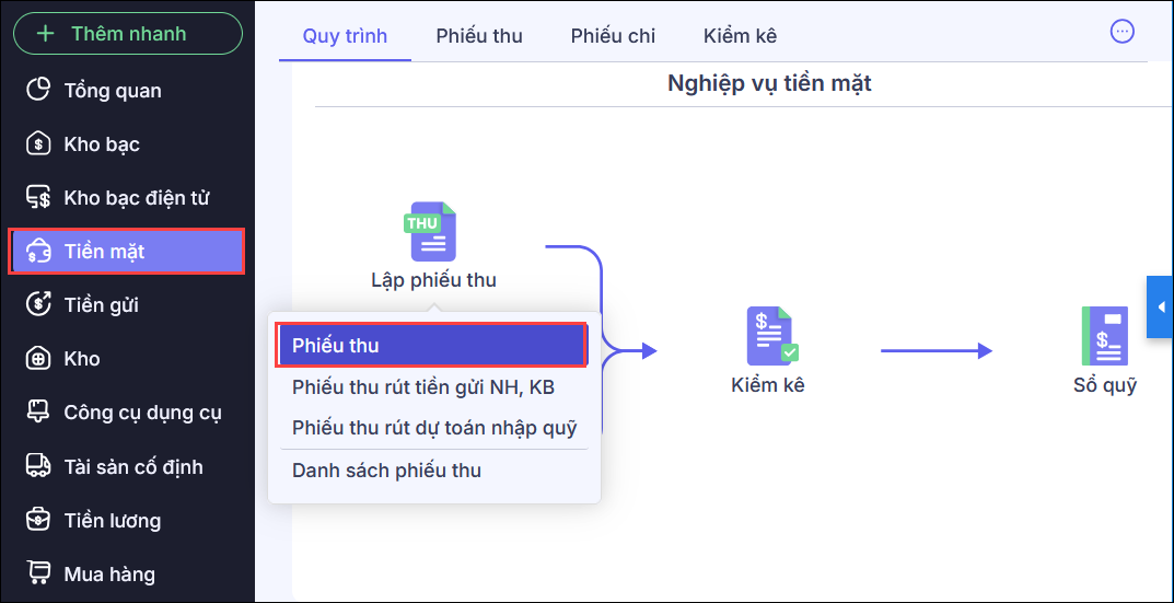 - Vào Tiền mặt\Quy trình \Lập phiếu thu nhấn chọn Phiếu thu