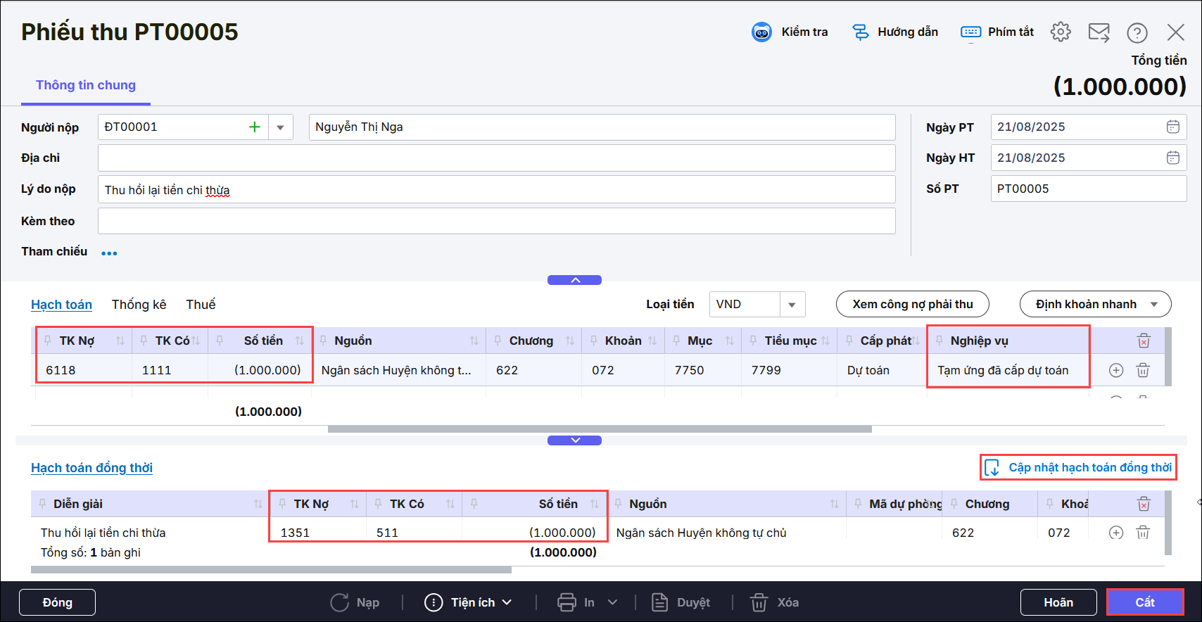 – Nhấn Cập nhật hạch toán đồng thời, hệ thống tự động hạch toán Nợ TK 1351/ Có TK 511 – Số tiền âm tương ứng với nghiệp vụ đã chọn nếu là nguồn không tự chủ