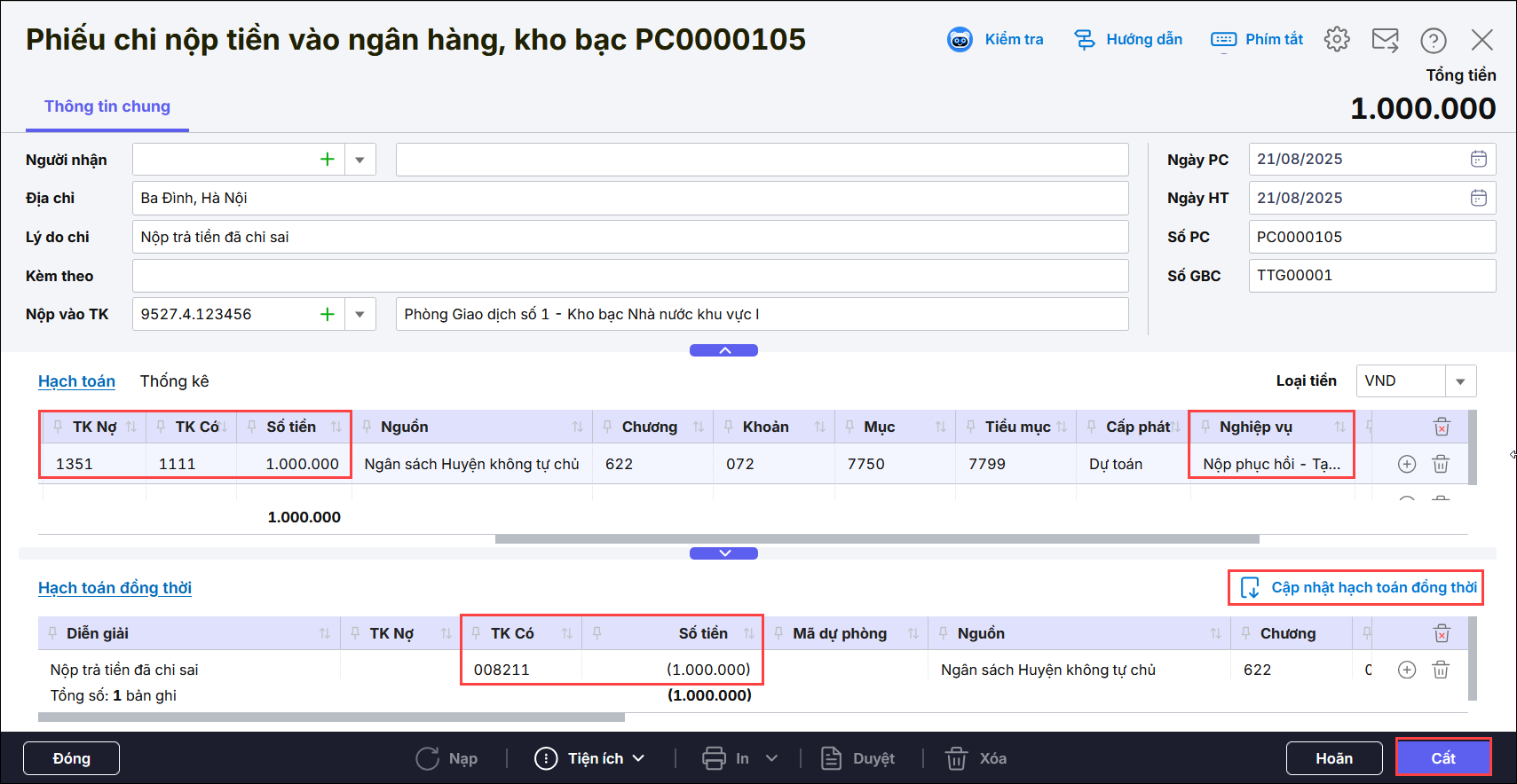 – Nhấn Cập nhật hạch toán đồng thời, hệ thống tự động hạch toán TK Có – Số tiền âm tương ứng với nghiệp vụ đã chọn.