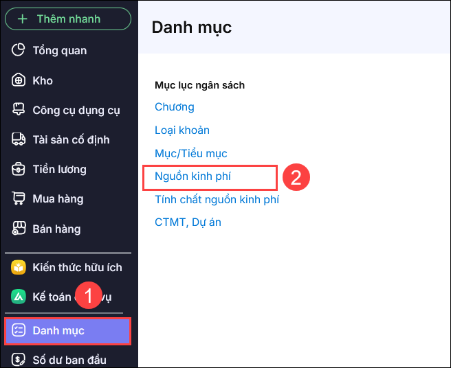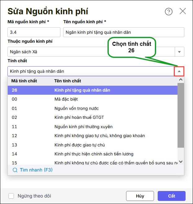 Bước 1: Tạo tính chất nguồn 26– Vào Danh mục\Tính chất nguồn kinh phí. – Nhấn Thêm và khai báo các thông tin ở tính chất nguồn 26: Nhập Mã tính chất và Tên tính chất nguồn kinh phí. Tích chọn Loại tính chất: không giao tự chủ (nếu nhận dự toán ở TK 9527) Chi tiết tham khảo hướng dẫn tại đây. Bước 2: Khai báo danh mục Nguồn 261. Vào Danh mục\Nguồn kinh phí