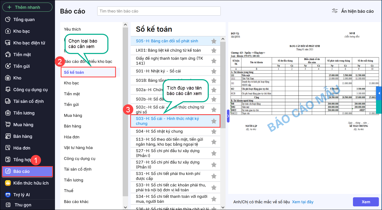 2.1 Cách tìm, mở báo cáo, sổ sách cần xem