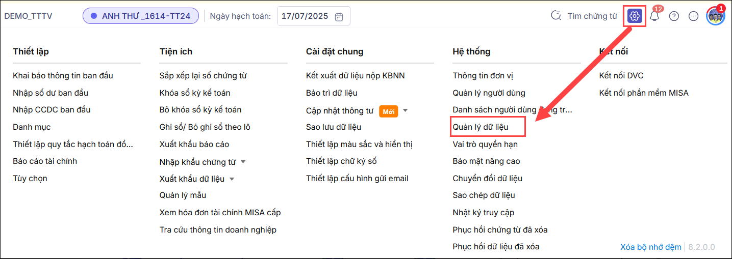 Bước 2: Vào Bánh răng ⚙(góc phải bên trên)\Hệ thống\Quản lý dữ liệu